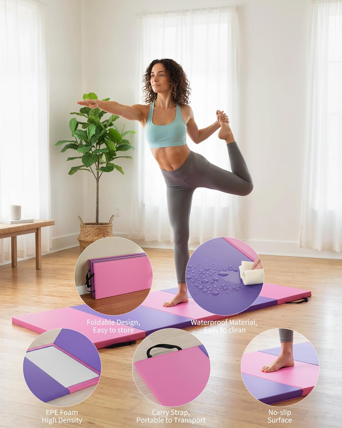 MULTI-USE TRAINING MAT: Designed for tumbling, yoga, pilates, aerobics, martial arts, and everyday home workouts, making it a practical floor mat for a variety of training routines.FOUR-FOLD DESIGN: Four-fold construction allows convenient folding and storage when not in use, helping save space in home gyms, bedrooms, living rooms, or workout corners.6.2 X 2.6 FT SIZE: Sized at 6.2 x 2.6 ft, this mat works well for individual training, warm-ups, stretching, and basic floor exercises while keeping size expectations clear and consistent.LEATHER SURFACE: Made with a leather surface for everyday home training use, offering a practical exterior for routine workouts and regular care after exercise sessions.HOME WORKOUT READY: Includes 1 folding gymnastics mat set for creating a more organized floor workout space for daily exercise, activity practice, or basic training at home.